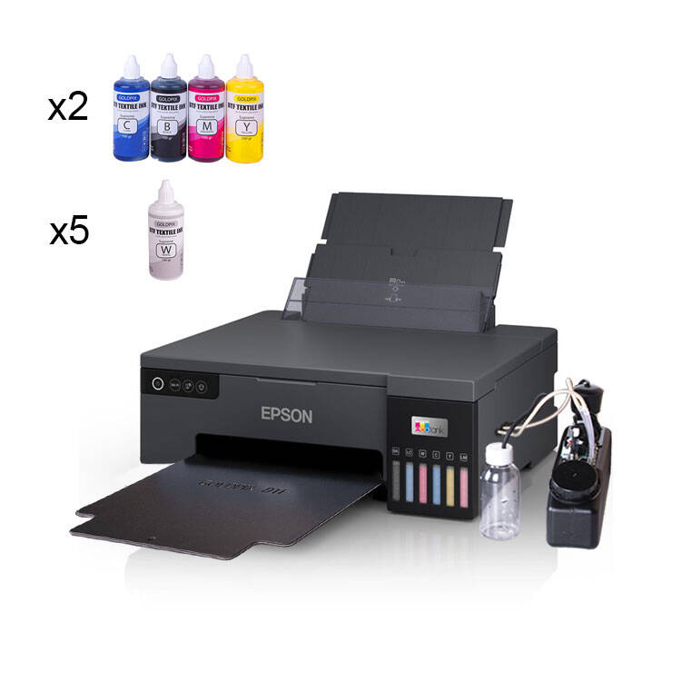Özel olarak modifiye edilmiş Epson L8050 A4 ebatında tekstil baskı yazıcısı CYMK+W mürekkepli, pet filme aynı anda hem renkli hem de beyaz çıktılar alarak koyu zemin, açık zemin farketmeksizin %100 pamuklu tişört, polyester, kadife, kaşmir, penye, deri gibi tüm kumaşlara, motlara, kazaklara, t-shirt'lere ve akla gelebilecek her türlü tekstil kumaş ürünlerine kaliteli baskılar yapabileceksiniz.