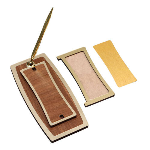 Ürün içeriği: 1 adet ahşap isimlik + 1 adet altın renkli metal kalem+ 1 adet fırçalı altın sublimasyon baskı metali