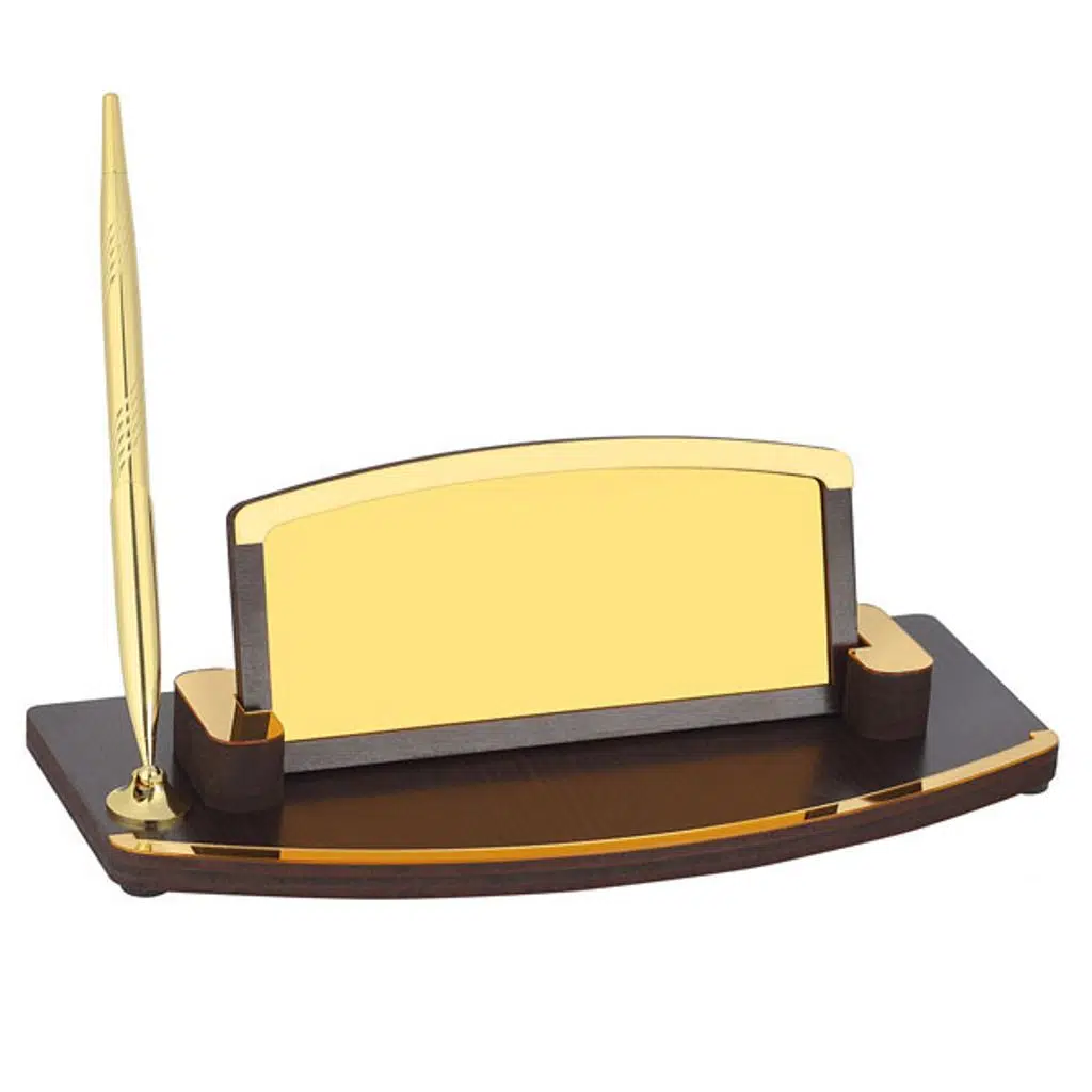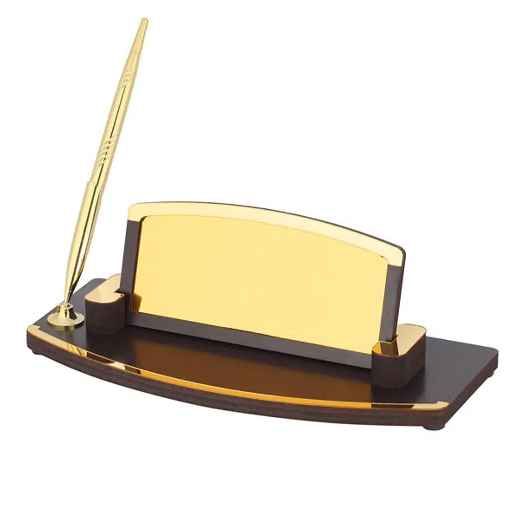 Ürün içeriği: 1 adet ahşap isimlik + 1 adet altın renkli sublimasyon baskı metali + 1 adet altın kalem