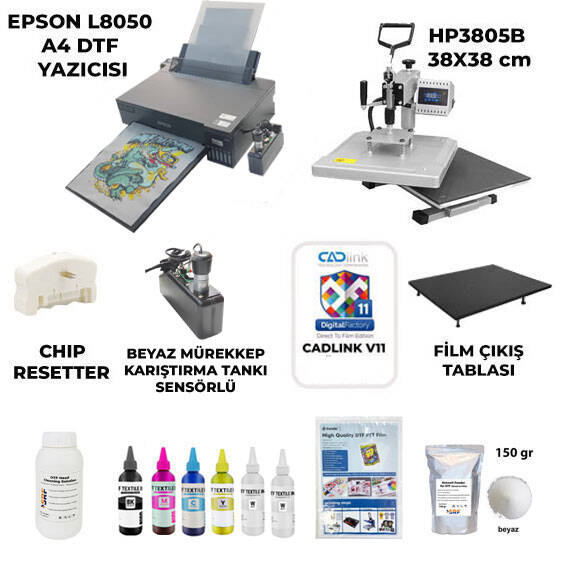 Tasarımlarınızı kumaş türü veya renk ayrımı olmaksızın t-shirt, çanta, yastık, şapka, kapşonlu, cibinlik, deri ve benzeri bir çok farklı kumaşlar üzerine aktarabileceğiniz beyaz mürekkepli yazıcı setidir.