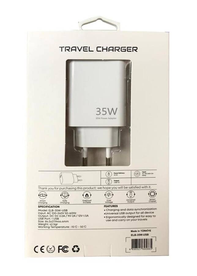Elba ELB11, güçlü 35W çıkış kapasitesiyle mobil cihazlarınızı hızlı ve güvenli şekilde şarj etmenizi sağlayan USB adaptör modelidir. Akıllı akım koruma devresi ve ısıya dayanıklı gövdesiyle hem performans hem güvenlik sunar. Ev tipi priz uyumlu yapısıyla günlük kullanımda ideal çözümdür.