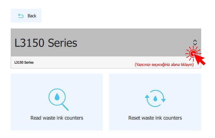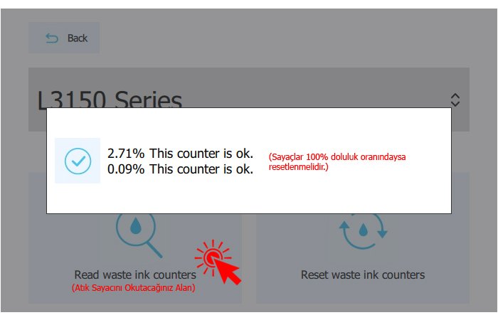 ⦾ 3- Yazıcınızın atık sayacını okutun. %100 doluluk oranına ulaşılmışsa reset yapınız.