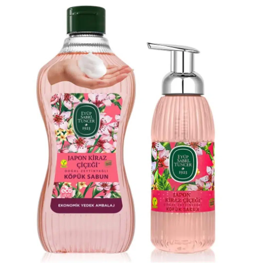 Eyüp Sabri Tuncer Japon Kiraz Köpük Sabun, baharın zarif kiraz çiçeği kokusunu günlük el temizliğine taşıyan özel formülüyle hijyen ve ferahlığı bir arada sunar. Büyük boy 1,5 lt ekonomik ambalaj ve pratik 500 ml pompalı şişe ile uzun süreli kullanım sağlar.