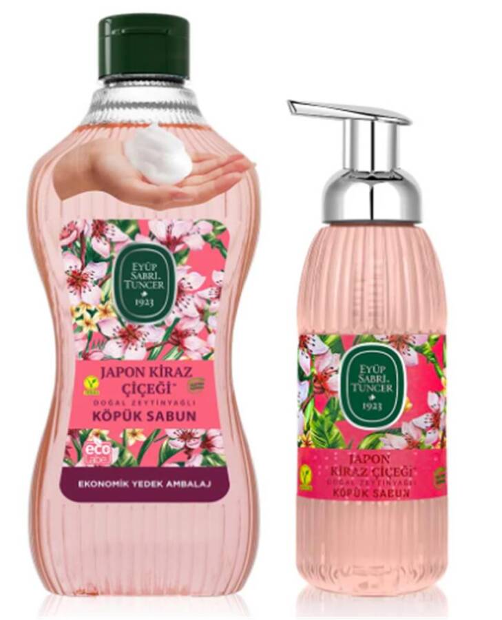 Eyüp Sabri Tuncer Japon Kiraz Köpük Sabun, baharın zarif kiraz çiçeği kokusunu günlük el temizliğine taşıyan özel formülüyle hijyen ve ferahlığı bir arada sunar. Büyük boy 1,5 lt ekonomik ambalaj ve pratik 500 ml pompalı şişe ile uzun süreli kullanım sağlar.