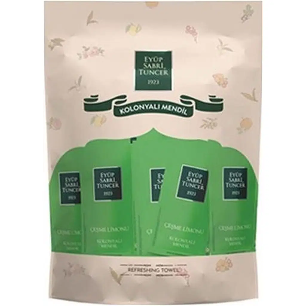 Eyüp Sabri Tuncer’in özel Çeşme limonu esansı ile zenginleştirilmiş kolonyalı mendilleri, hijyen ve ferahlığı bir arada sunar. 150’li paket halinde pratik kullanım sağlar. Geleneksel kolonya kültürünü modern mendil formunda yaşatarak misafir ikramlarında, seyahatlerde ve günlük kullanımda şıklık ve hijyen sağlar.