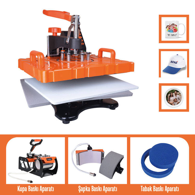 Tüm süblimasyon ve transfer baskı işlemlerinizi yapabileceğiniz 2 yıl garantili profesyonel 29x38cm 5in1 combo transfer baskı makinesidir. Her çeşit süblimasyon ürününe transfer kağıdı ile baskı yapılır. Kullanımı kolay ve uygulama alanı çok geniş bir makinedir.