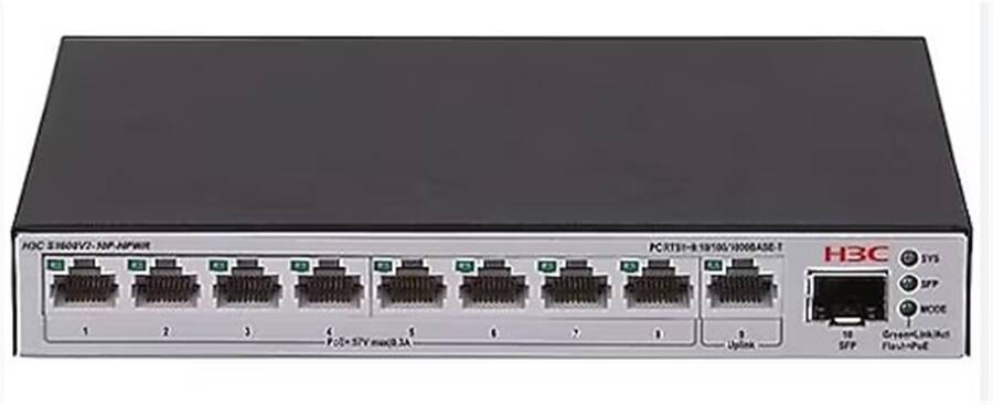 H3C S1600V2-10P-HPWR L2 9x 10-100-1000 BASE-T Ports (8x PoE+ Ports) 1x 1G SFP Port, 125W PoE+ Switch