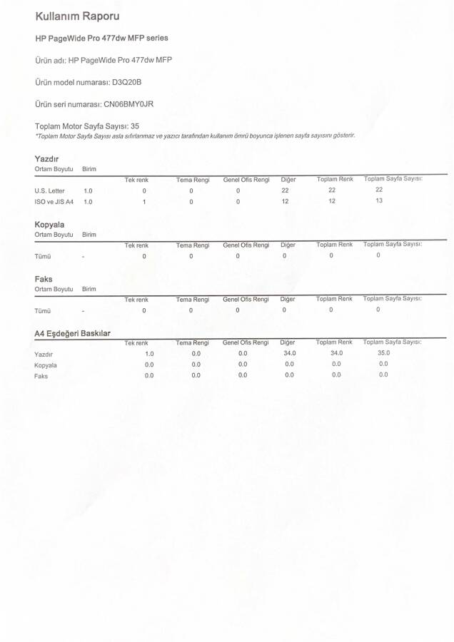 Ürün ilk kurulumu yapılmıştır. Teşhir ürünüdür. Toplam baskı sayısı 35'dir. Baskı kalite raporu görseldedir.