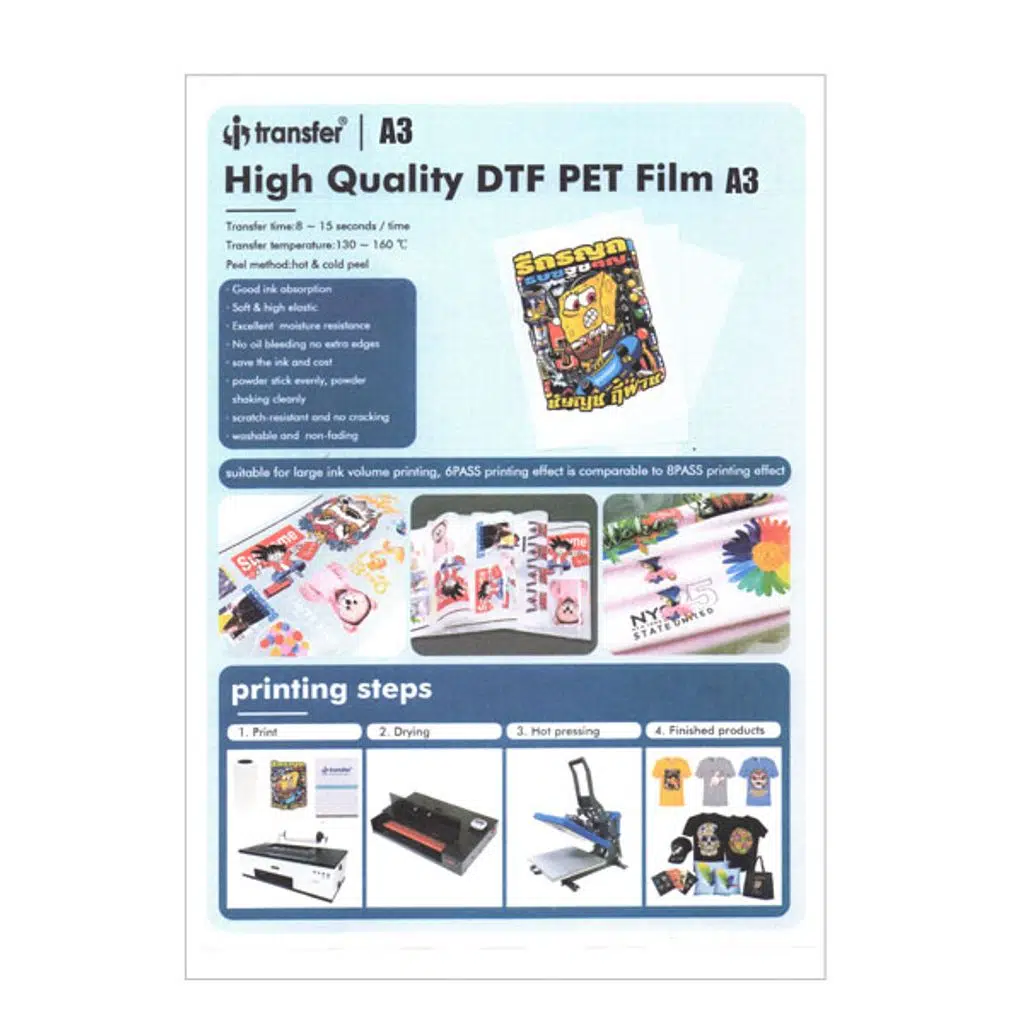 DTF pet film transfer kağıdı, A3 boyutunda olup kutu içerisinden 100 adet çıkmaktadır.
