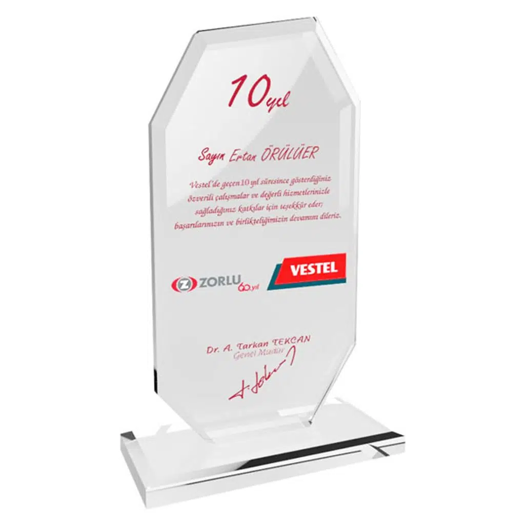 Kristal malzemeden üretilmiştir.Kristal plaket ve üzerine monte edilerek dik durmasını sağlayan ayak olmak üzere 2 parçadan oluşmaktadır.