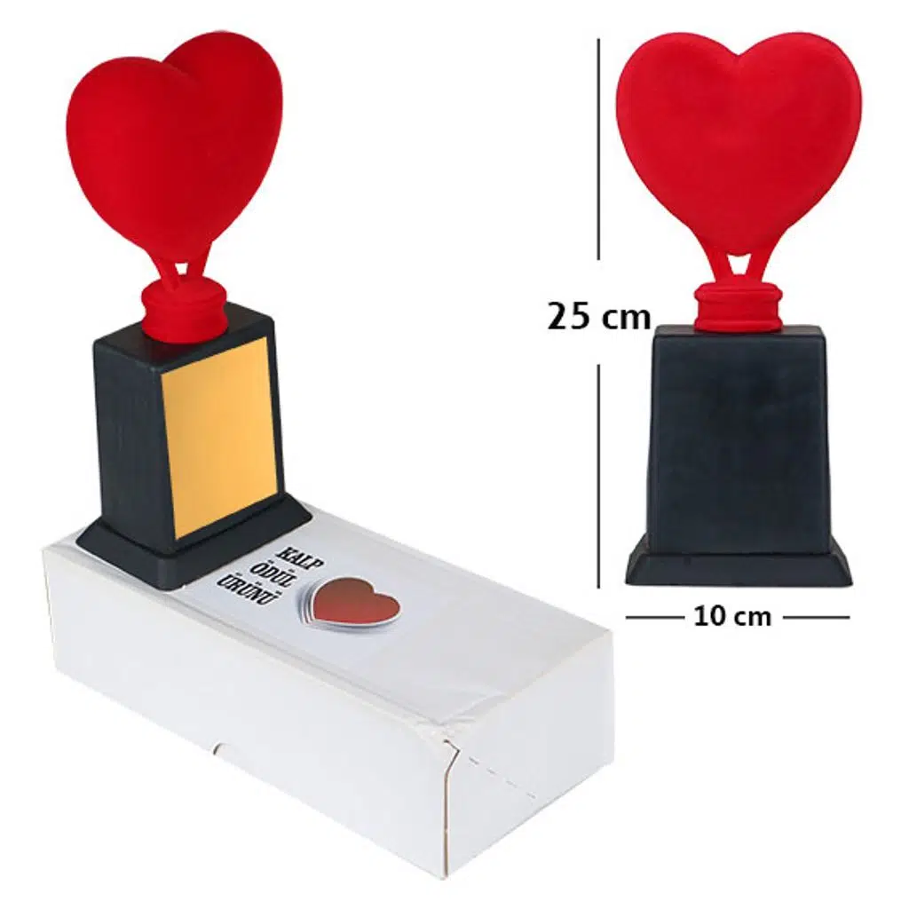 Kırmızı kalp ödülü beyaz ve kalın koruma karton kutusu içerisindedir.