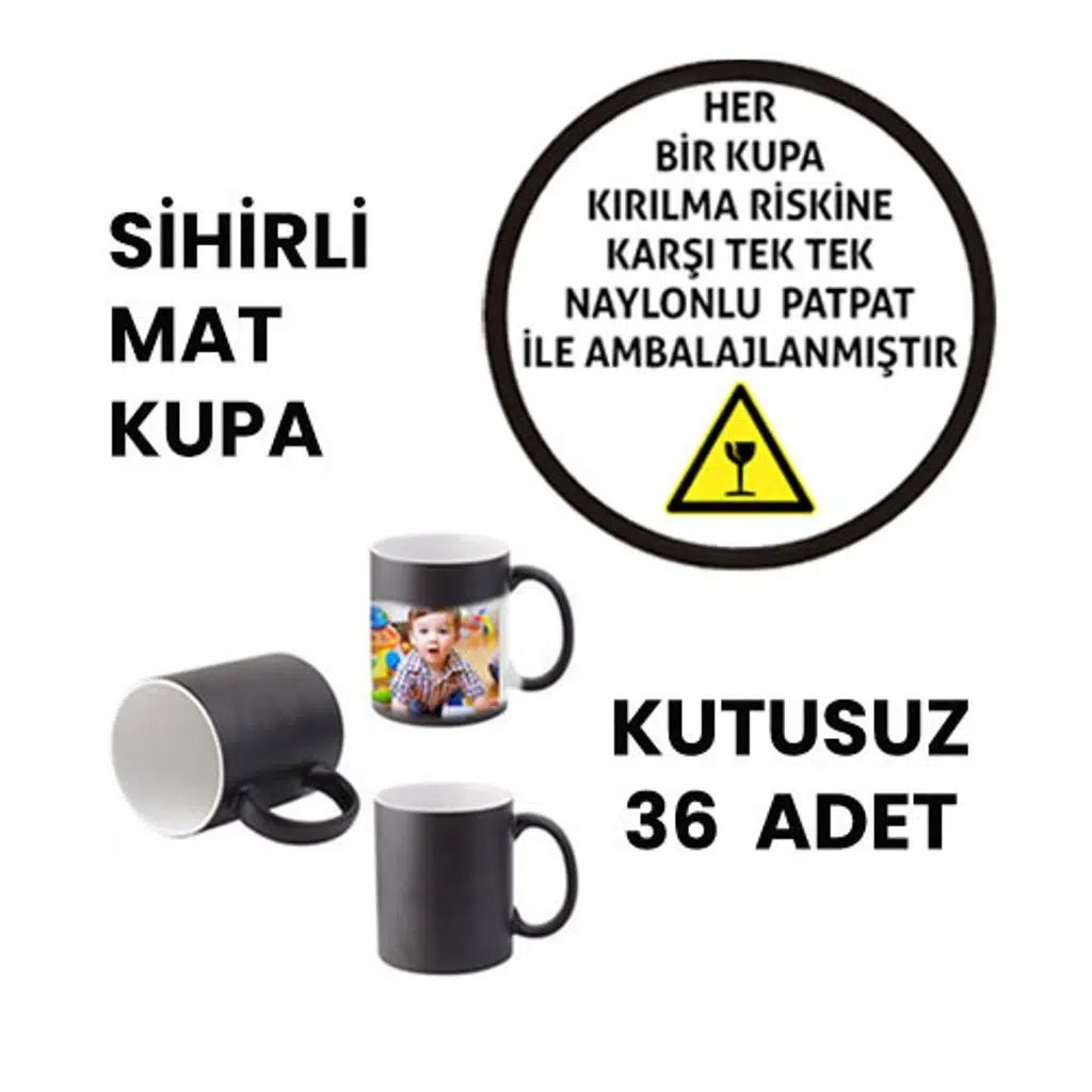 Sublimasyon Porselen MAT Siyah Sihirli Kupa - 36 adetSublimasyon ve laser baskıya uygun, üzeri özel kaplamalı ithal MAT siyah renkli porselen kupalardır. Renk değiştiren sihirli kupalar soğuk iken siyah görüntüsü olan ama içerisine sıcak sıvı konulduğunda rengi beyazlaşarak üzerindeki baskıyı gösteren bir üründür. Soğuduğunda tekrar siyah renge dönüşerek üzerindeki baskıyı gizler.Baskı Talimatı: