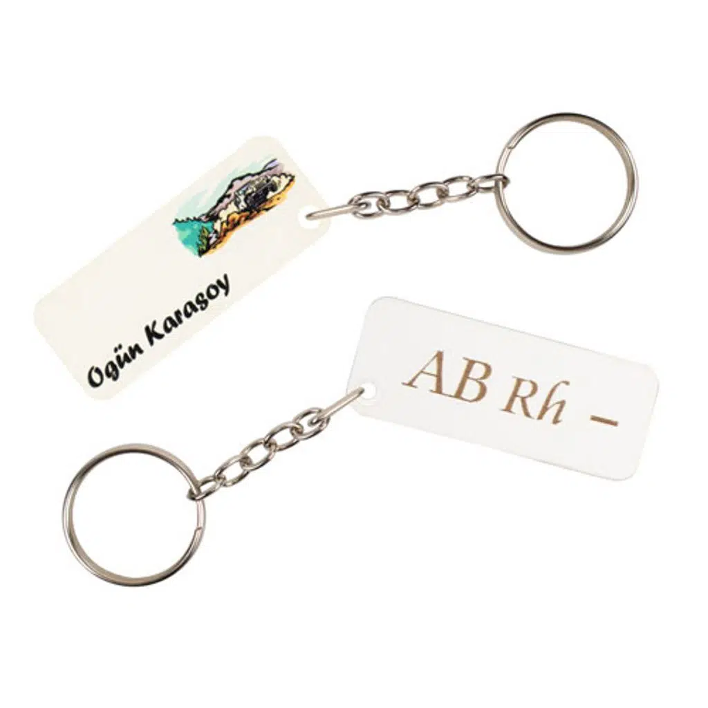 Anahtarlığın bir yüzeyi lazer makinesinde kazıma yöntemi kullanılarak AB RH (-) kan grubu yazılmıştır.