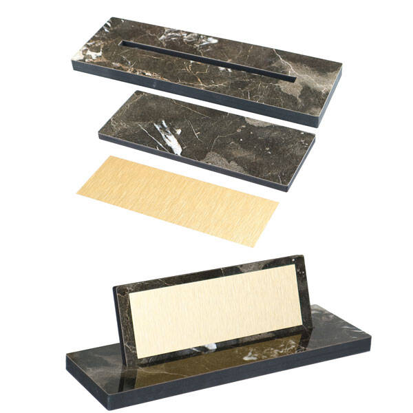 Ahşabın sıcaklığı ve mermerin zarif dokusunun mükemmel uyumuyla tasarlanan bu isimlik, kişisel stilinizi ve ciddiyetinizi yansıtmak için ideal bir aksesuar.