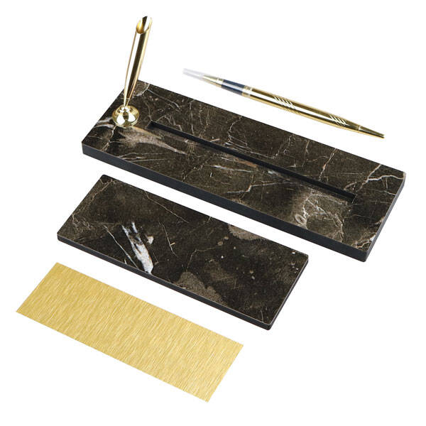 Ürün içeriği: 1 adet mermer desenli ahşap isimlik + 1 adet altın renkli kalem + 1 adet  altın renkli sublimasyon baskı metali