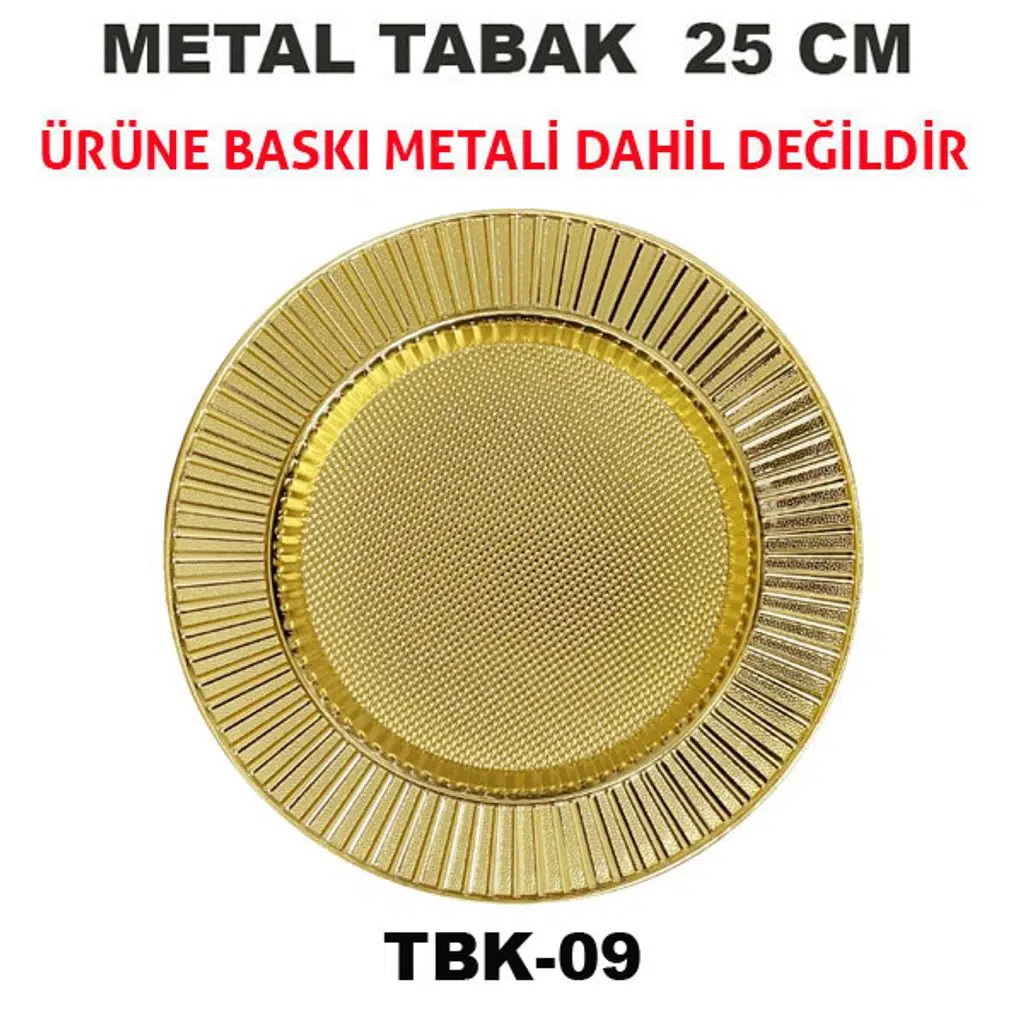 Tabak çapına uygun kesilmiş yuvarlak baskı metalleri ( beyaz, aynalı altın , aynalı gümüş , fırçalı altın , fırçalı gümüş) satın alarak metale baskınızı yapıp tabak göbeğine bu metali yapıştırmanız gerekir.