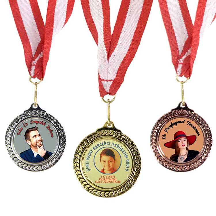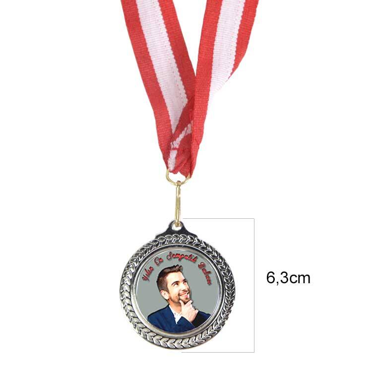 Süblimasyon transfer baskıya uygun, çapı 6,3 cm ebatlarında altın, gümüş ve bronz madalyon.