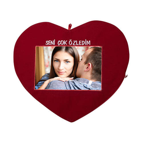 Sublimasyon baskıya uygun, ''Seni Çok Özledim'' nakışlı, kırmızı renkte, kalp şeklinde ve yatay baskı alanı sahip olan bir yastık kılıfıdır.