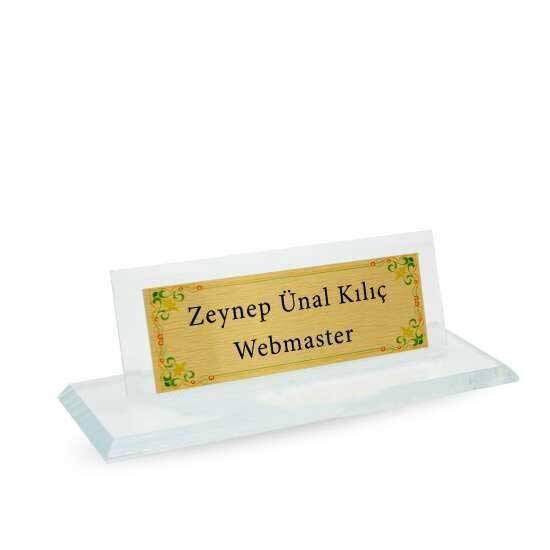 Kaliteli kristal cam malzemeden üretilmiş altın renk metaline baskı uygulayıp müşterilerinize sunabileceğiniz masa isimliği stoklarımızda !​