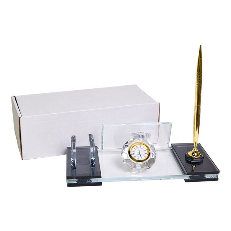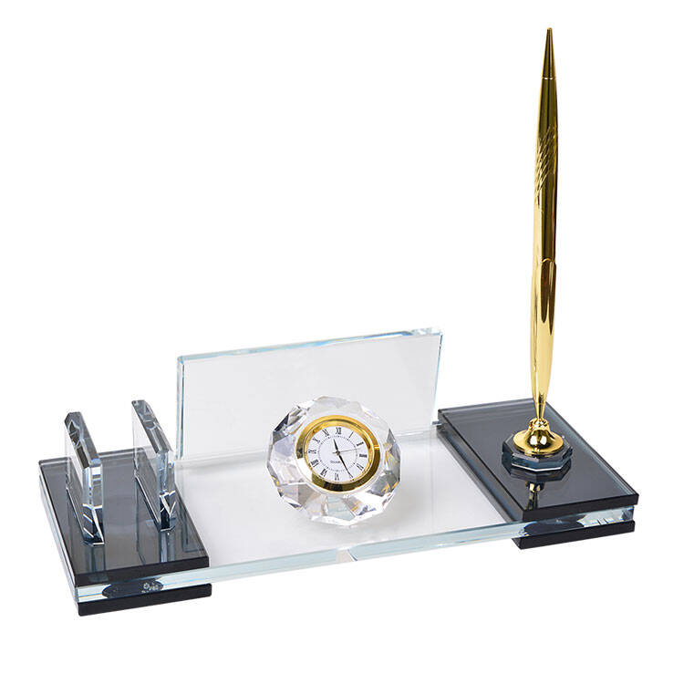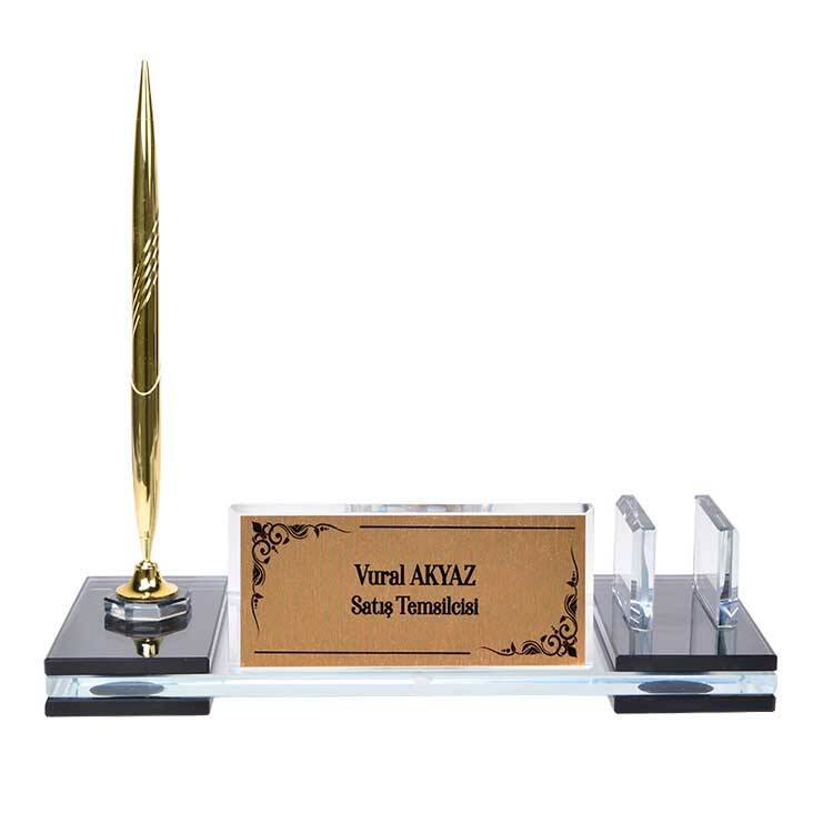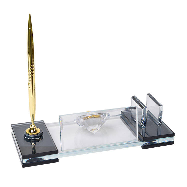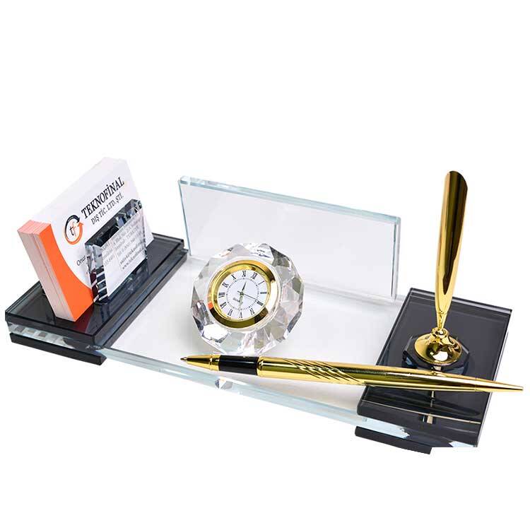 Üzerinde kartvizit, saat ve altın kalem aksesuarlarıyla ofislerinizde masanızda eşsiz bir şıklık katabileceğiniz, kaliteli işçiliği ve malzemesiyle uzun yıllar rahatlıkla kullanabileceğiniz modern görünümlü dekoratif kristal masa isimliği.