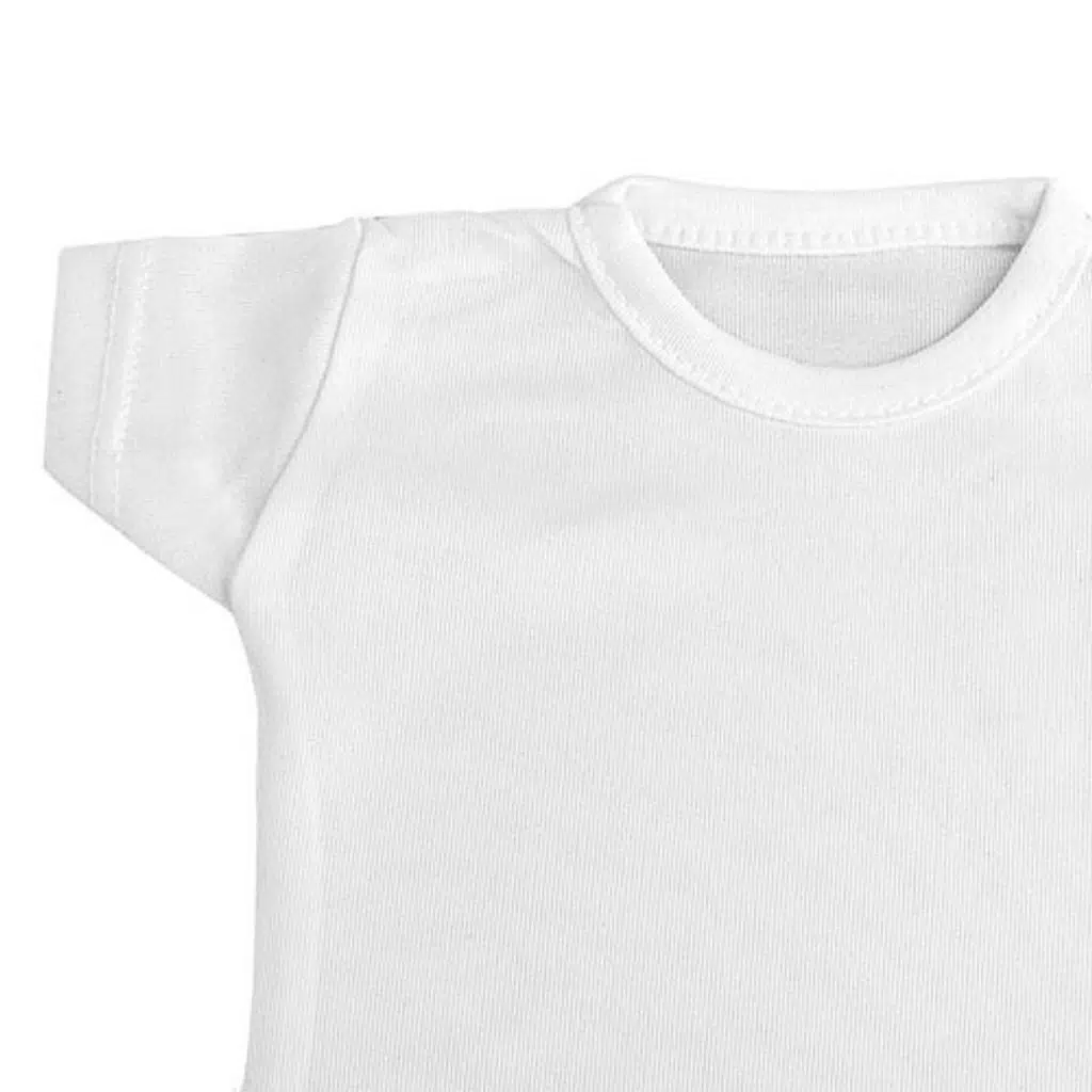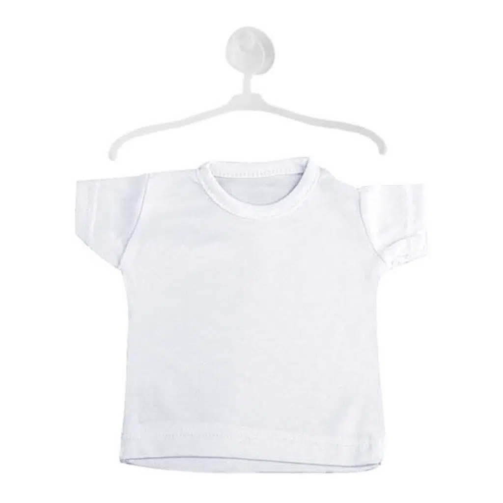 Sublimasyon ve lazer transfer baskıya uygun askı aparatlı, beyaz renkte mini t-shirt.