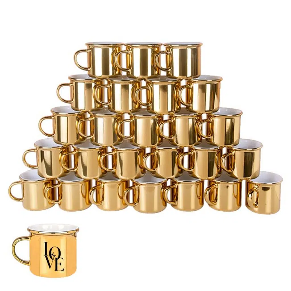 Toptan Süblimasyon Porselen Enamel Altın kupa Bardak koli içerisinde 36 adet bulunmaktadır. Toptan Altın enamel Porselen kupa bardaklar %80 porselen %20 seramik malzemeden üretilmiştir. En çok tercih edilen hediyeliklerden biri olan toptan kupa bardaklarımız fiyat avantajı olması için kutusuz satılmaktadır.