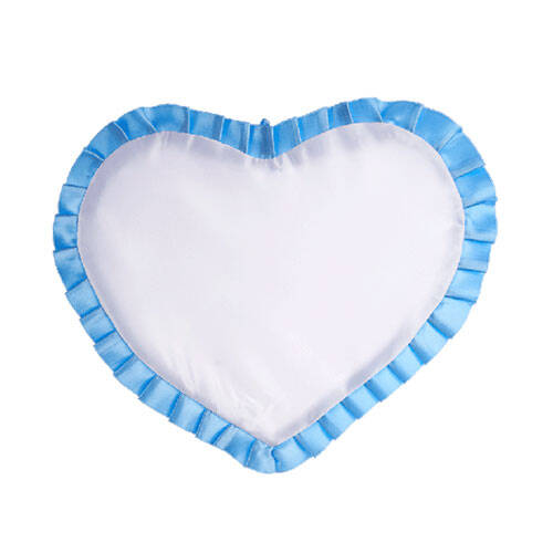 Sublimasyon ve lazer baskıya uygun, kenarı mavi fırfırlı, saten bir kalp yastık kılıfıdır.