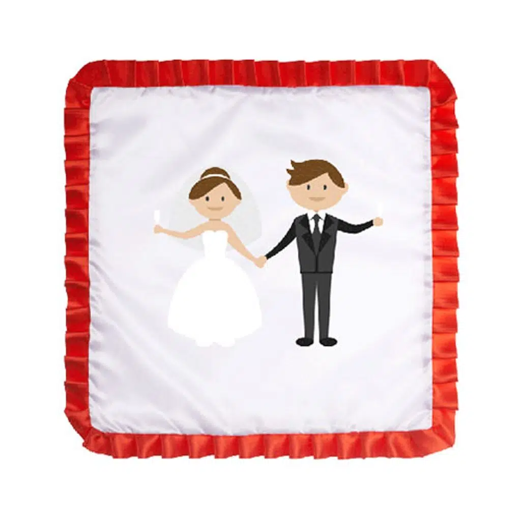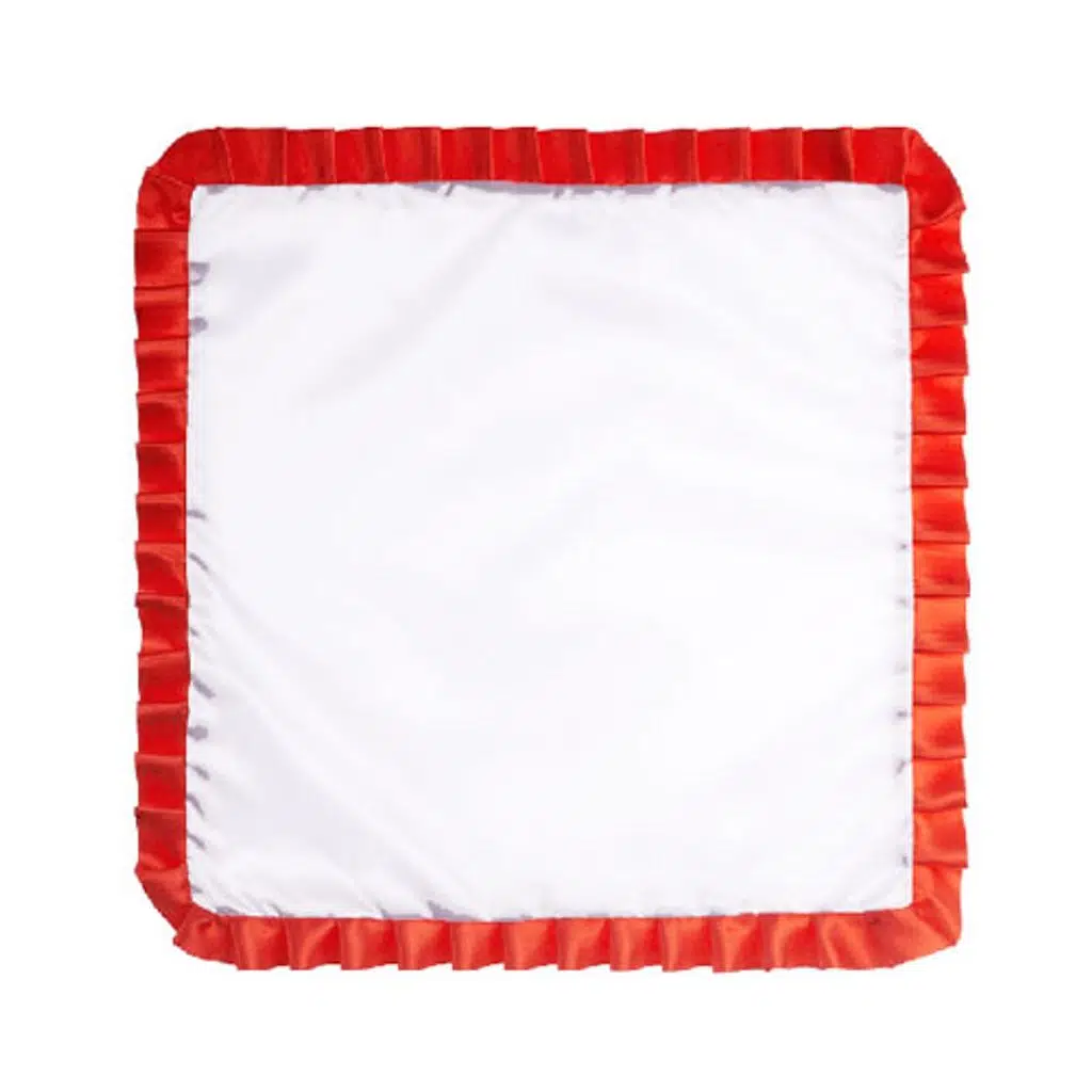 Sublimasyon ve lazer baskıya uygun, kenarı kırmızı fırfırlı, saten bir kare yastık kılıfıdır.