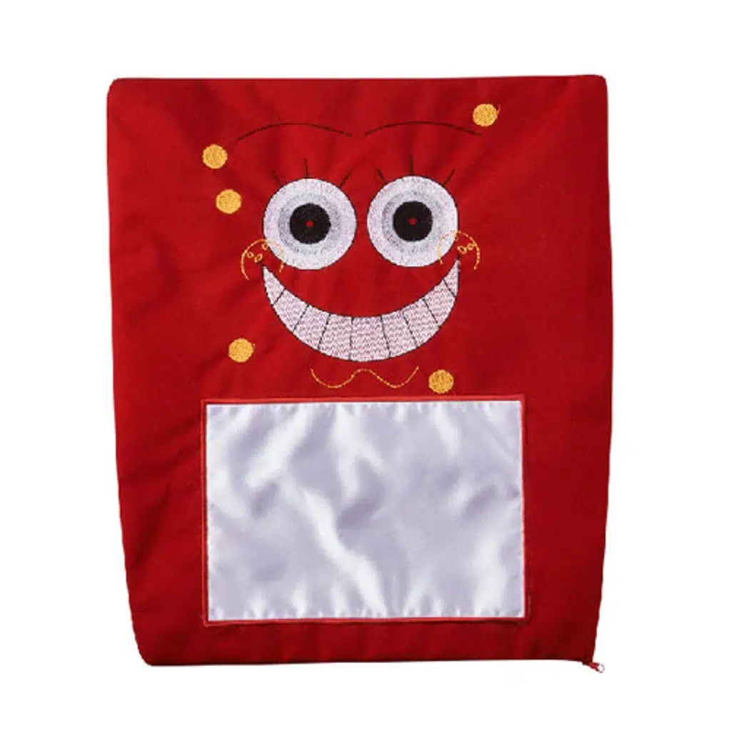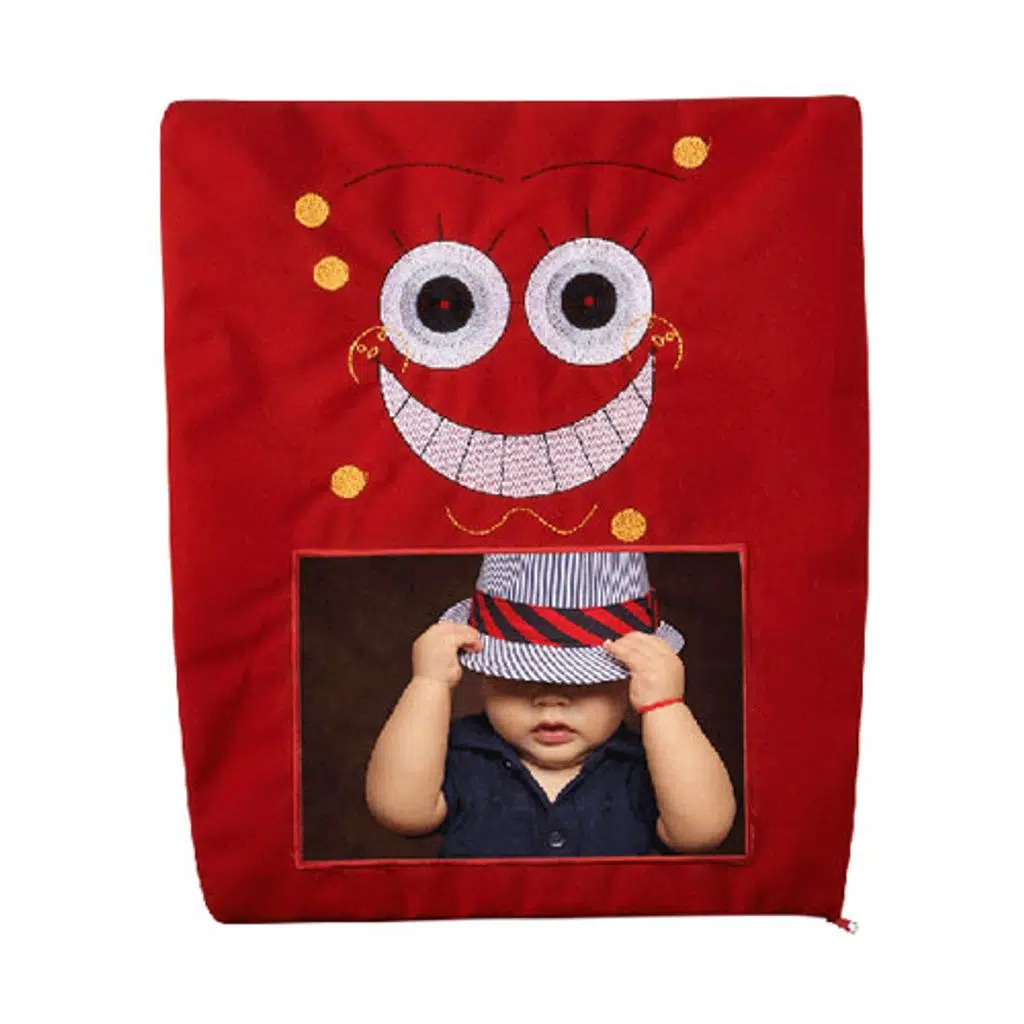Sublimasyon baskıya uygun, kadife malzemeden üretilmiş gülen yüz şeklinde, kırmızı renkli bir kare yastık kılıfıdır.