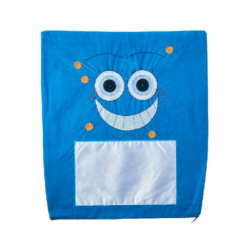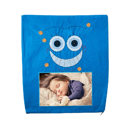 Sublimasyon baskıya uygun, kadife malzemeden üretilmiş gülen yüz şeklinde, mavi renkli kare bir yastık kılıfıdır.