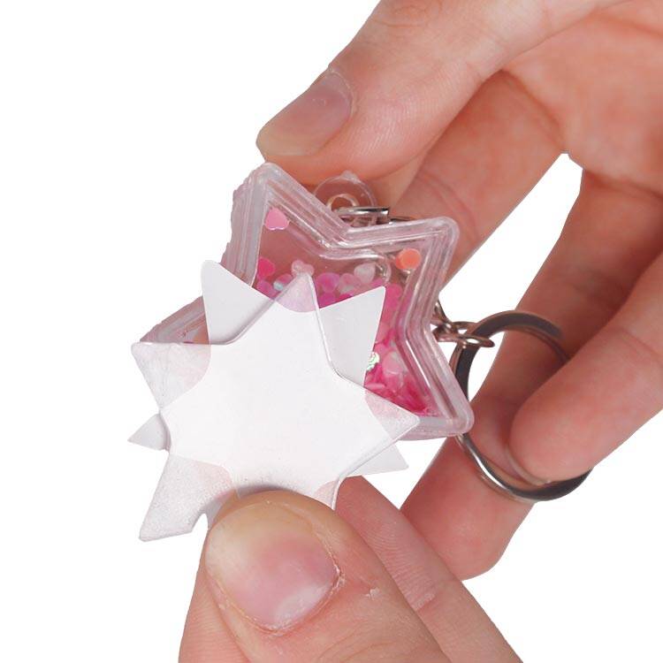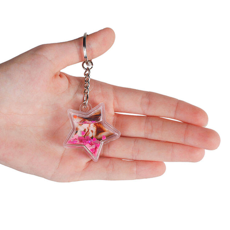Arkalı önlü 2 adet fotoğraf yerleştirebileceğiniz toptan yıldız görünümlü kar küresi anahtarlık.